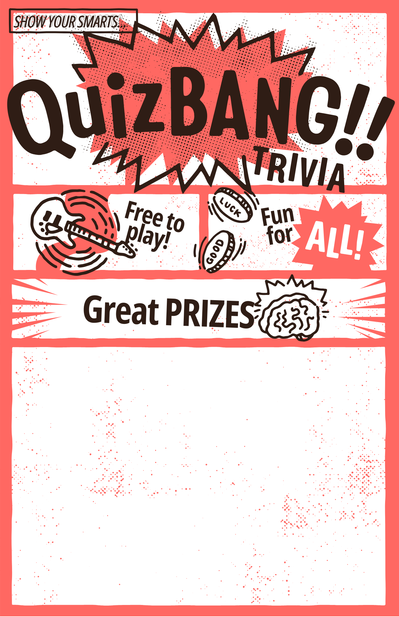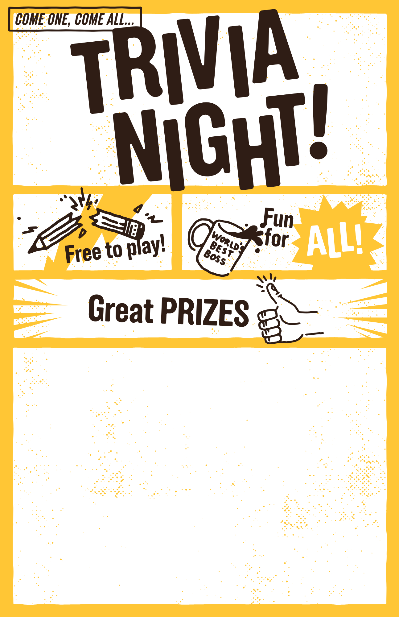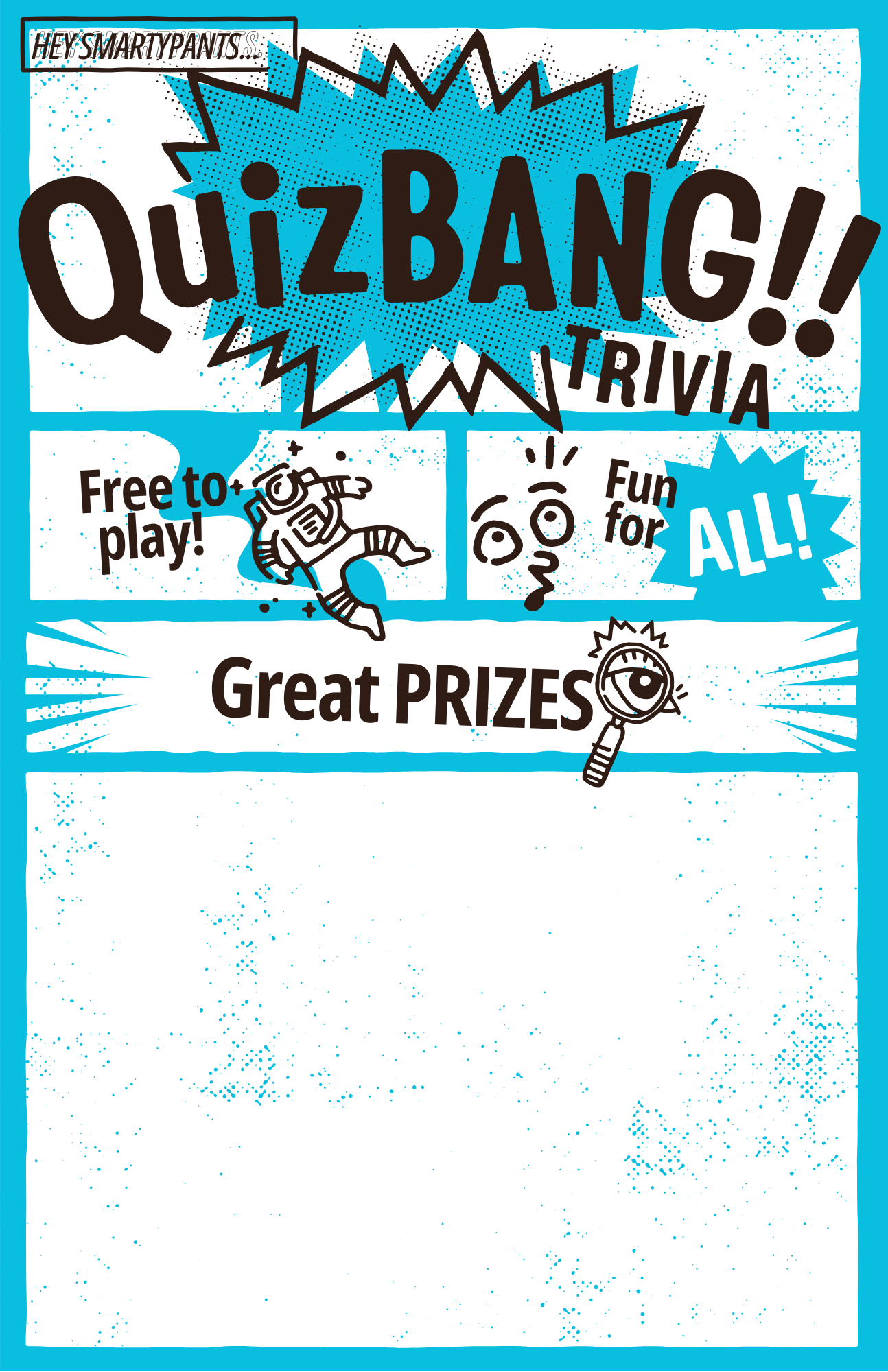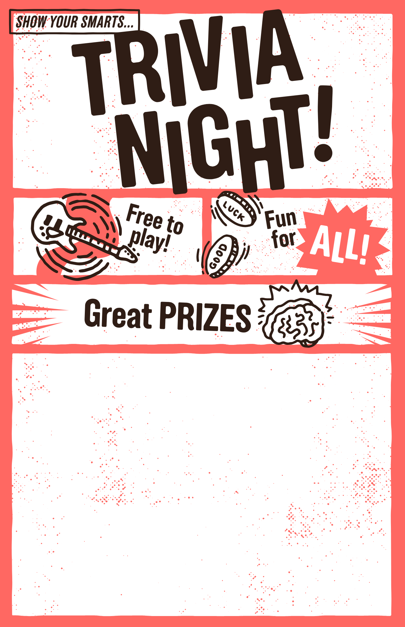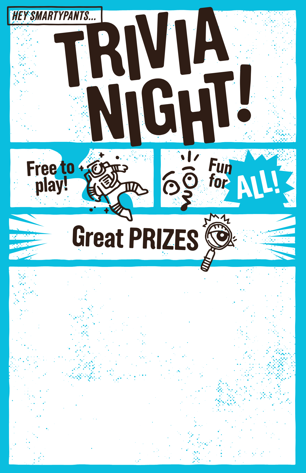 Put them up everywhere - let your patrons know when trivia is happening. Each 11x17” poster design has a blank space for you to add the day and time of your trivia. You can use any program, like Canva, that adds text to images to customize your poster.