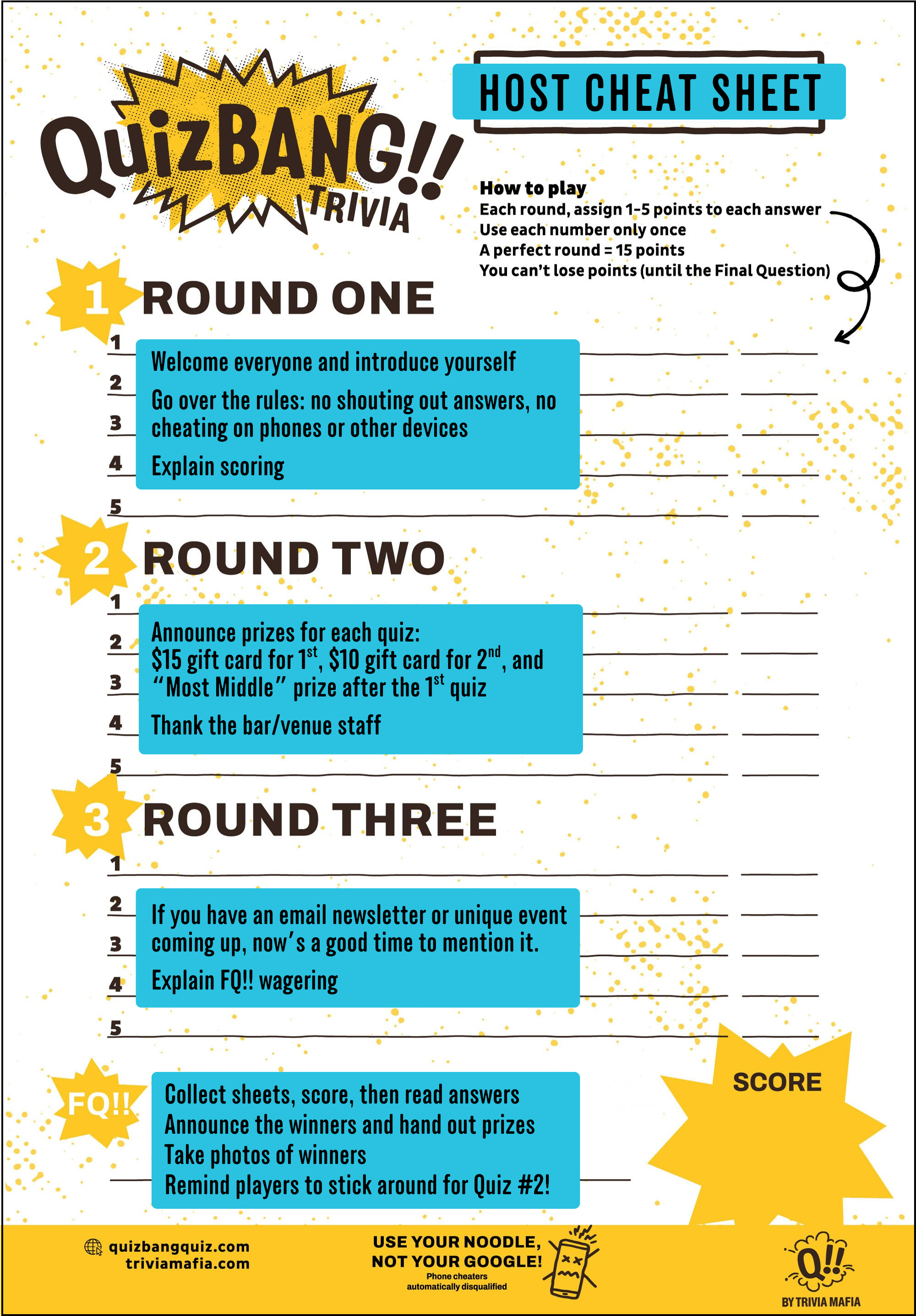 Need a quick reference guide for your host? We’ve got you (and them) covered! You can download and print our QuizBang Host Cheat Sheet here.